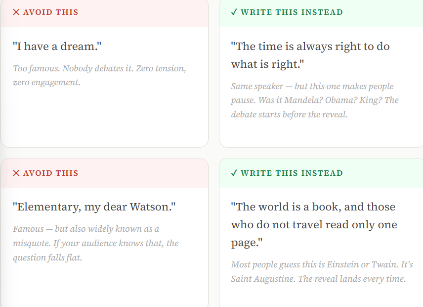 ❌ Using quotes that are too famous. "Be the change you wish to see in the world" is instantly recognisable. Nobody debates it, nobody comments. Find the lesser-known quotes from well-known people, the ones that sound like they could belong to two or three different speakers.
