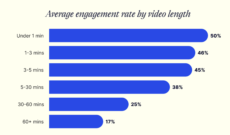 - Videos under 1 minute have ~50% engagement rates