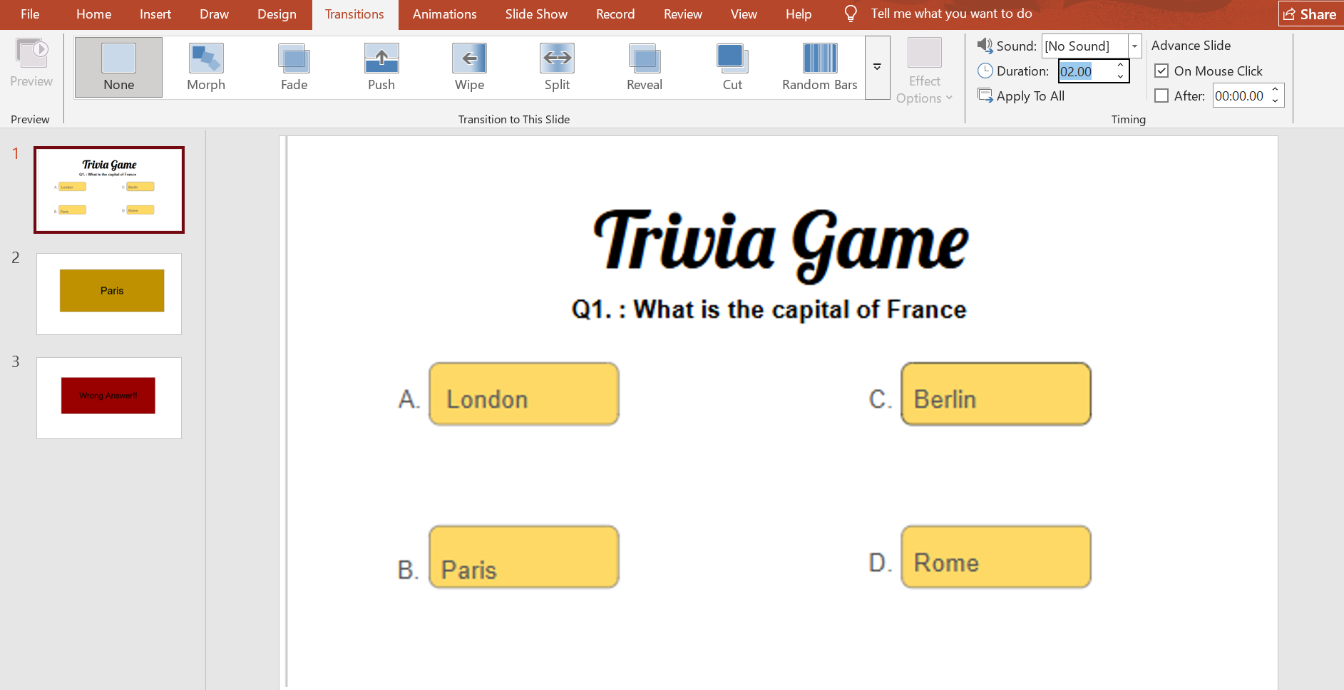 Once your first question is wired up, select both the Question Slide and the Correct Answer Slide, copy them, and paste. Swap in a new question and shuffle the answer positions to keep things interesting.