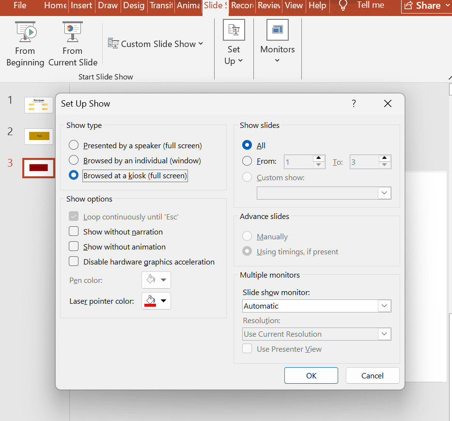 - Go to Slide Show > Set Up Slide Show and select Browsed at a Kiosk (full screen). This locks navigation to your hyperlinks only.