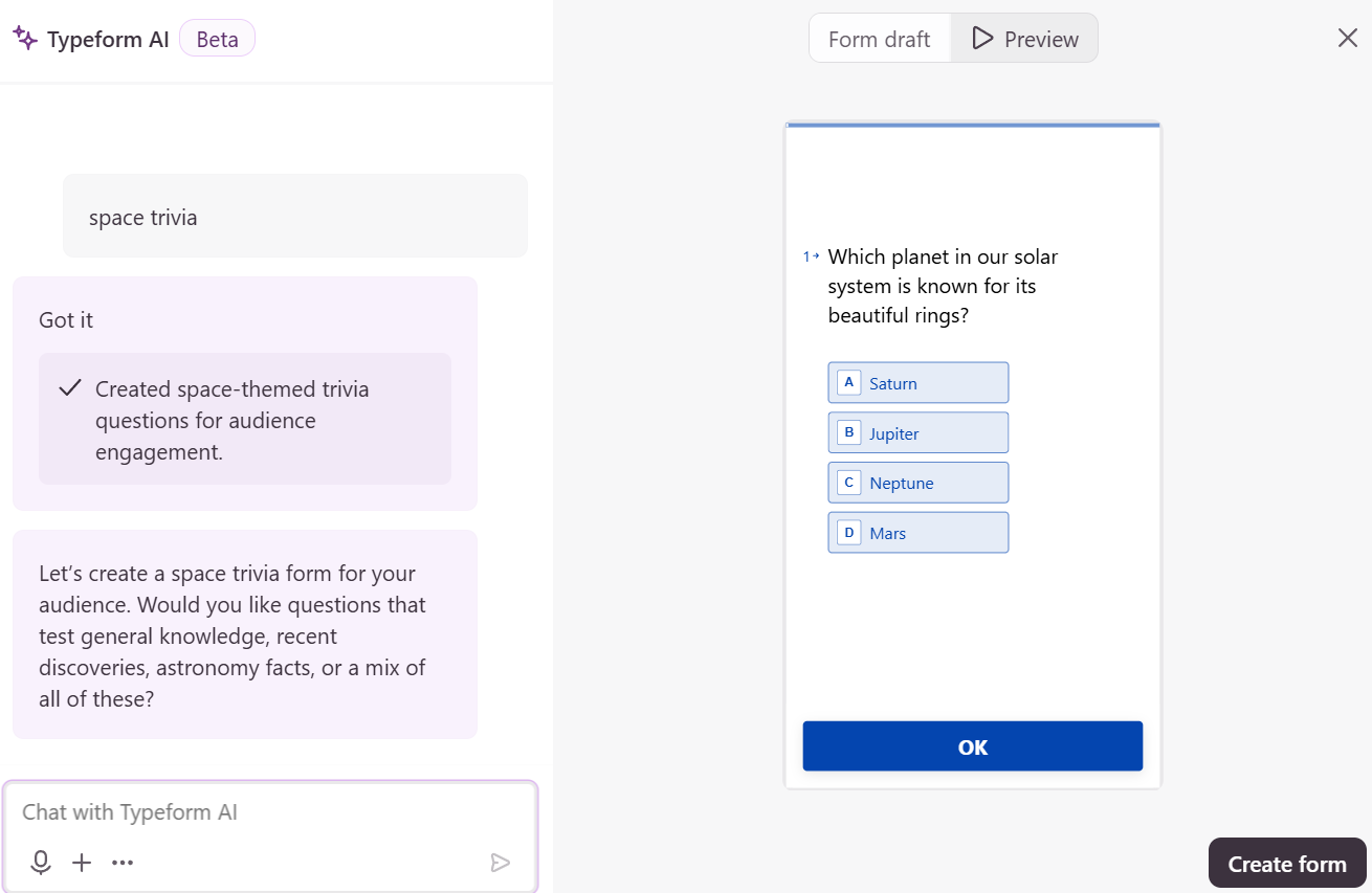 What it does well: One question at a time. Typeform is more of a conversation rather than a form, and it works remarkably well for personality quizzes, customer research, and lead qualification.