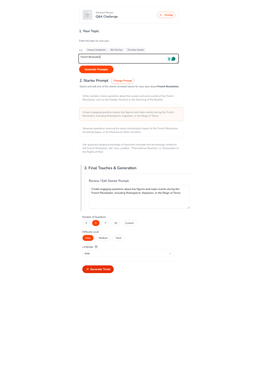 Go to Trivia by Typito AI, enter your topic, and Typito generates a prompt for you. Review it, pick the one that fits your angle, and move to the next step. You can edit the prompt before generating if you want to tweak the framing.