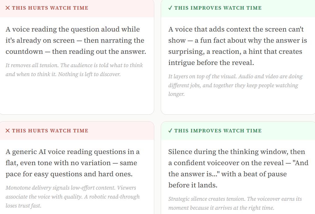 In trivia content, some kinds of voiceover add tension, context, or payoff. Others simply repeat what is already visible and slow the format down.